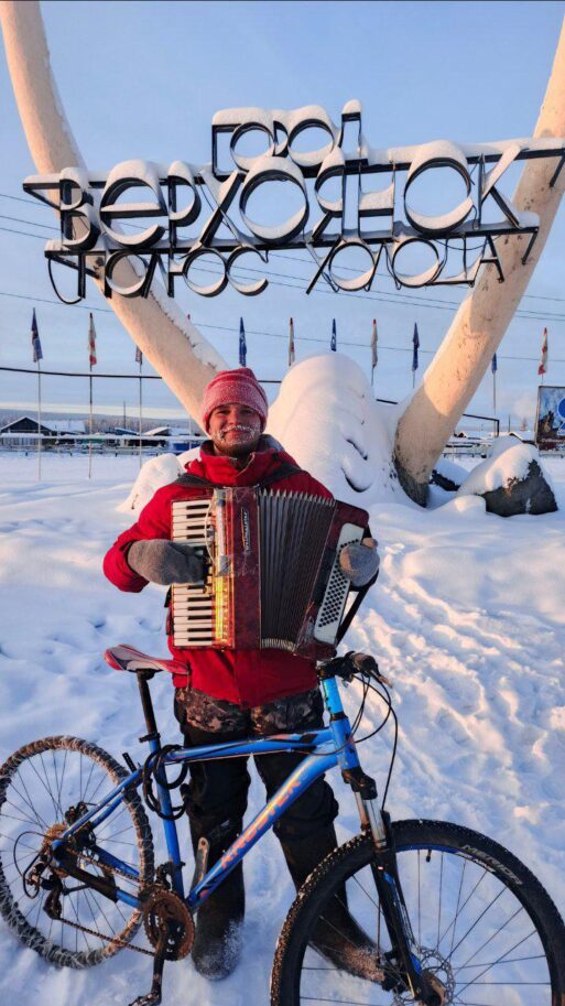 Путешественник-экстремал достиг Полюса холода на велосипеде с аккордеоном