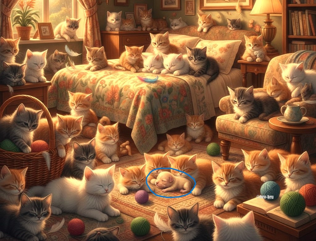 На этой уютной картинке мило дремлют множество кошек и котят. Ваша задача сходу найти щеночка! Подчеркнем, что найти щеночка нужно сходу. Таким образом проверяем быстроту реакции вашего мозга. Даём на поиски буквально 5 секунд! Справитесь?