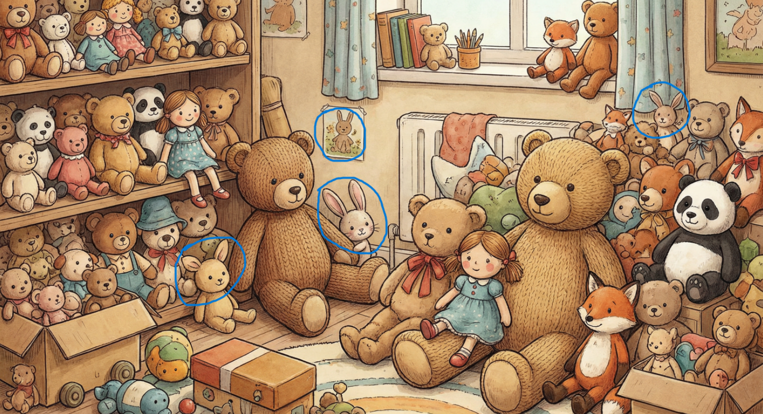 Как уютно разместились мягкие игрушки в комнате любящей хозяйки. Ваша задача — найти зайчика. Подсказка: их тут несколько! Справитесь за 10 секунд?