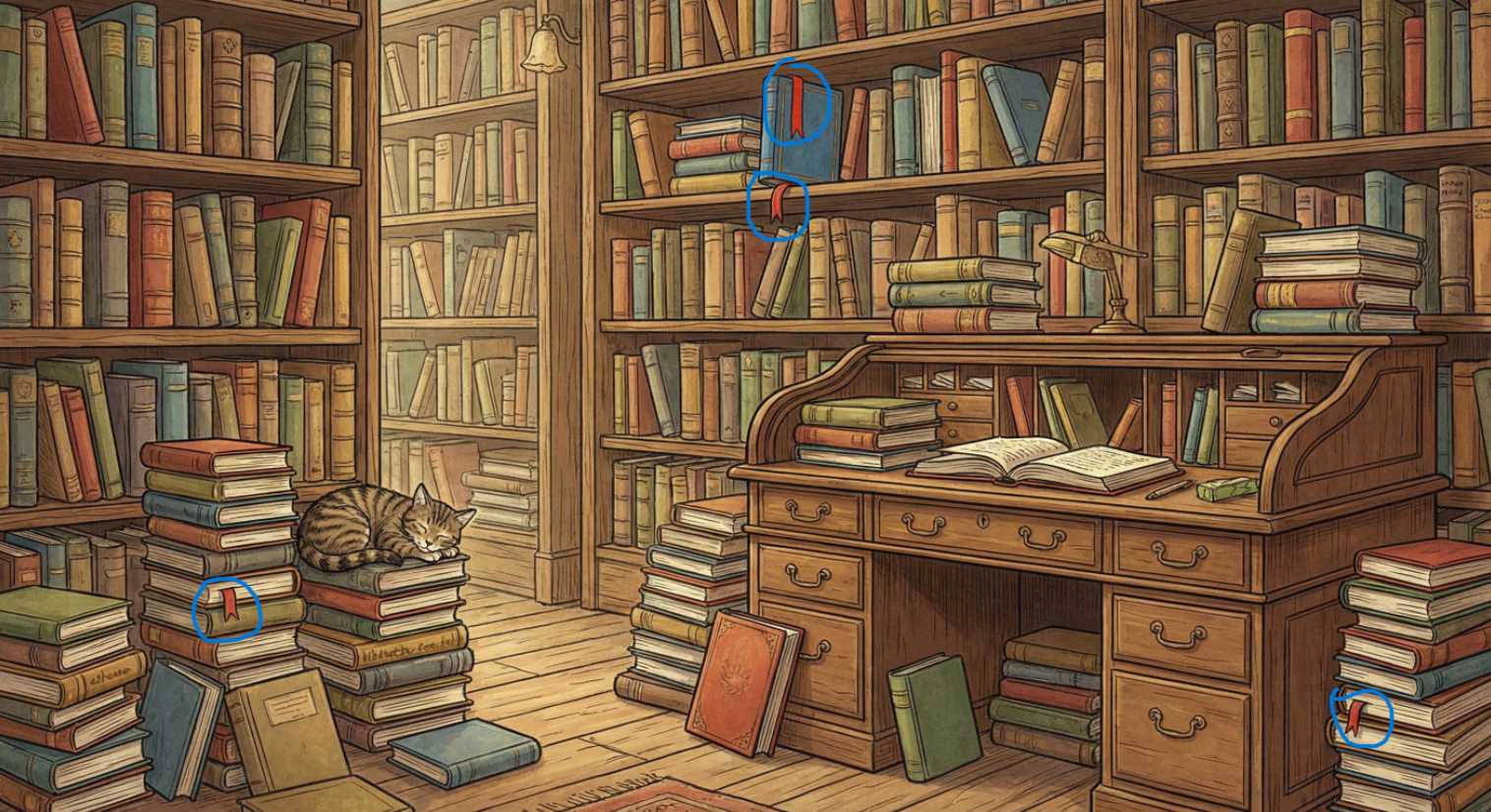 В библиотечной комнате царит молчаливая идиллия. Ваша задача — найти все закладки в книгах! Справитесь за 10 секунд?