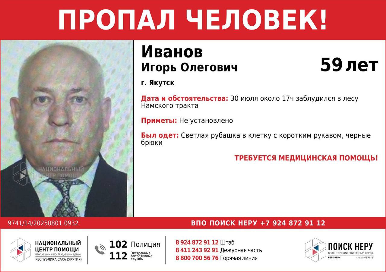 30 июля мужчина 59 лет пошел по грибы на Намский тракт и заблудился в районе между 39 и 40 километрами. Имеет проблемы со здоровьем.
