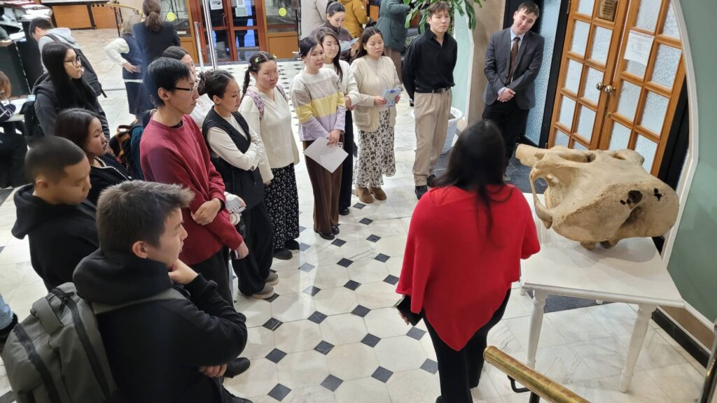 Студенты разных специальностей СВФУ имени М.К. Аммосова, предварительно по интернету записавшись на экскурсию в Академии наук Якутии в рамках акции «Наука рядом», вчера плодотворно и полезно провели свой досуг. Ребятам, среди которых были студенты второго, третьего курса и магистранты, вначале показали экспозицию палеонтологических находок Отдела изучения мамонтовой фауны академии. Перед ребятами выступила научная сотрудница отдела – Екатерина Нестерова, рассказав о костных останках древних животных, найденных специалистами отдела не только в северных районах республики, но и в Центральной Якутии. Затем последовало выступление Туйары Едисеевой – руководителя Научно-экспертного и аналитического центра АН РС(Я), поведавшей вначале об истории исторического здания нашей республики, в котором размещается главный корпус высшего научного заведения республики, далее она ознакомила ребят с выставкой научных трудов сотрудников АН Якутии.
