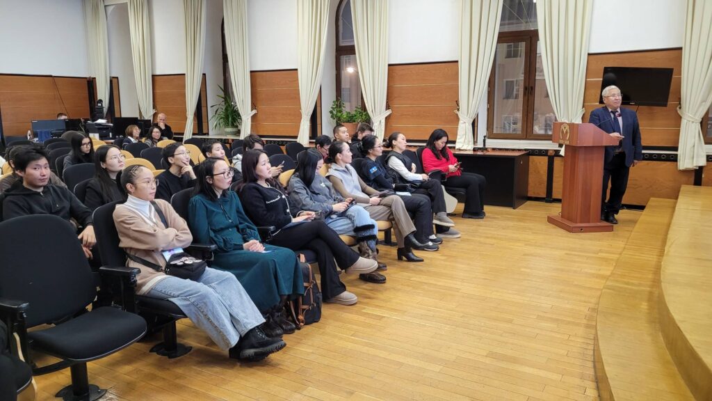 В актовом зале АН РС(Я) ребята встретились с вице-президентом АН РС(Я) Сергеем Поповым, который рассказал о деятельности Академии наук РС(Я), далее прошло выступление младшего научного сотрудника Отдела мамонтовой фауны АН РС(Я) Екатерины Нестеревой «О деятельности Совета молодых ученых и специалистов при Правительстве Республики Саха (Якутия)». Она является руководителем департамента образования и науки Молодёжного правительства республики.