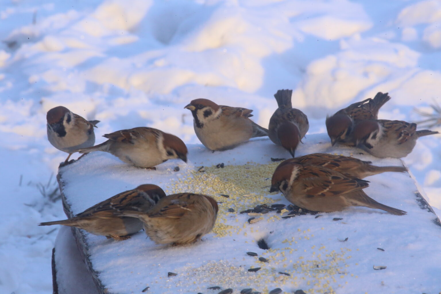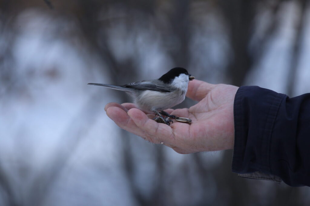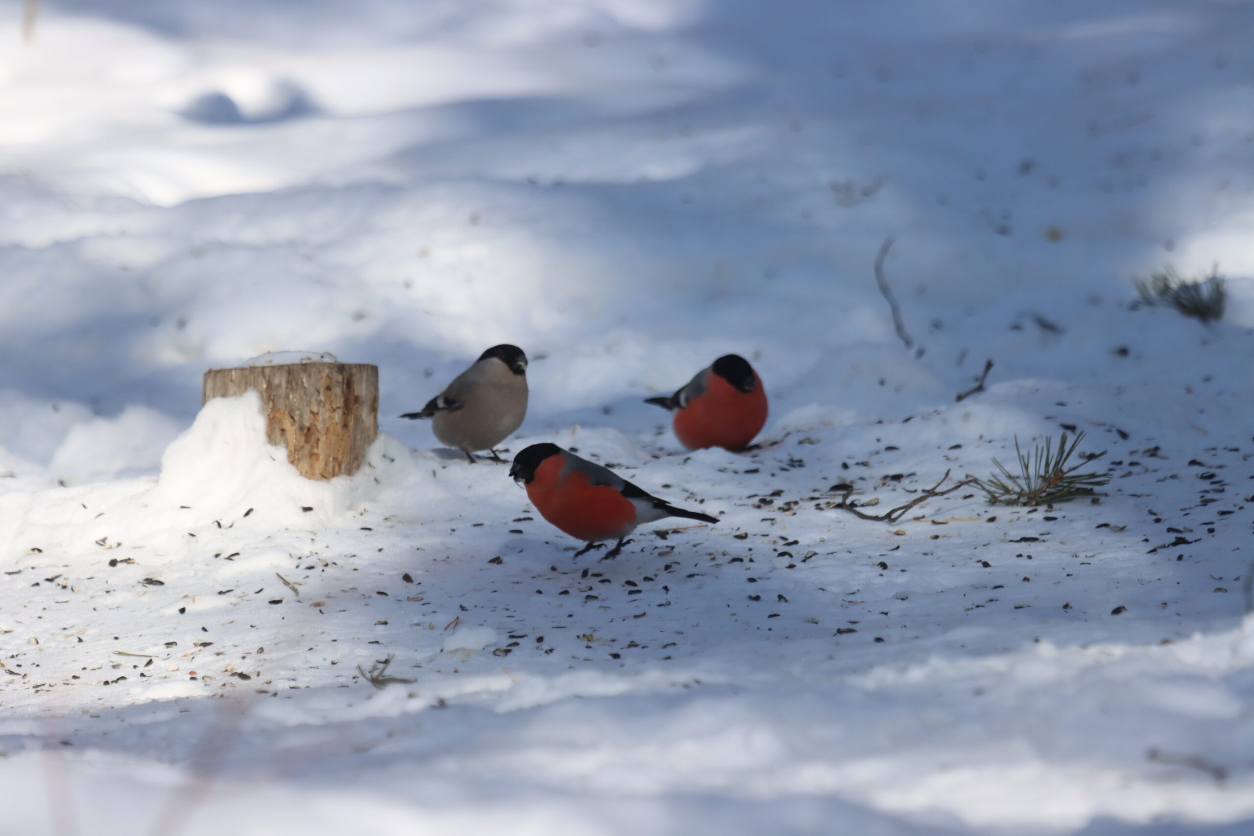 И за эти пять лет с удивлением видим, что белки, синички-гаички совершенно перестали бояться людей, при подходе и побрякивании баночками с семечками подлетают, без боязни садятся на руки и на голову. Поползни тоже иногда садятся. Только крупные синицы, снегири, дятлы и желны пока держатся поодаль.