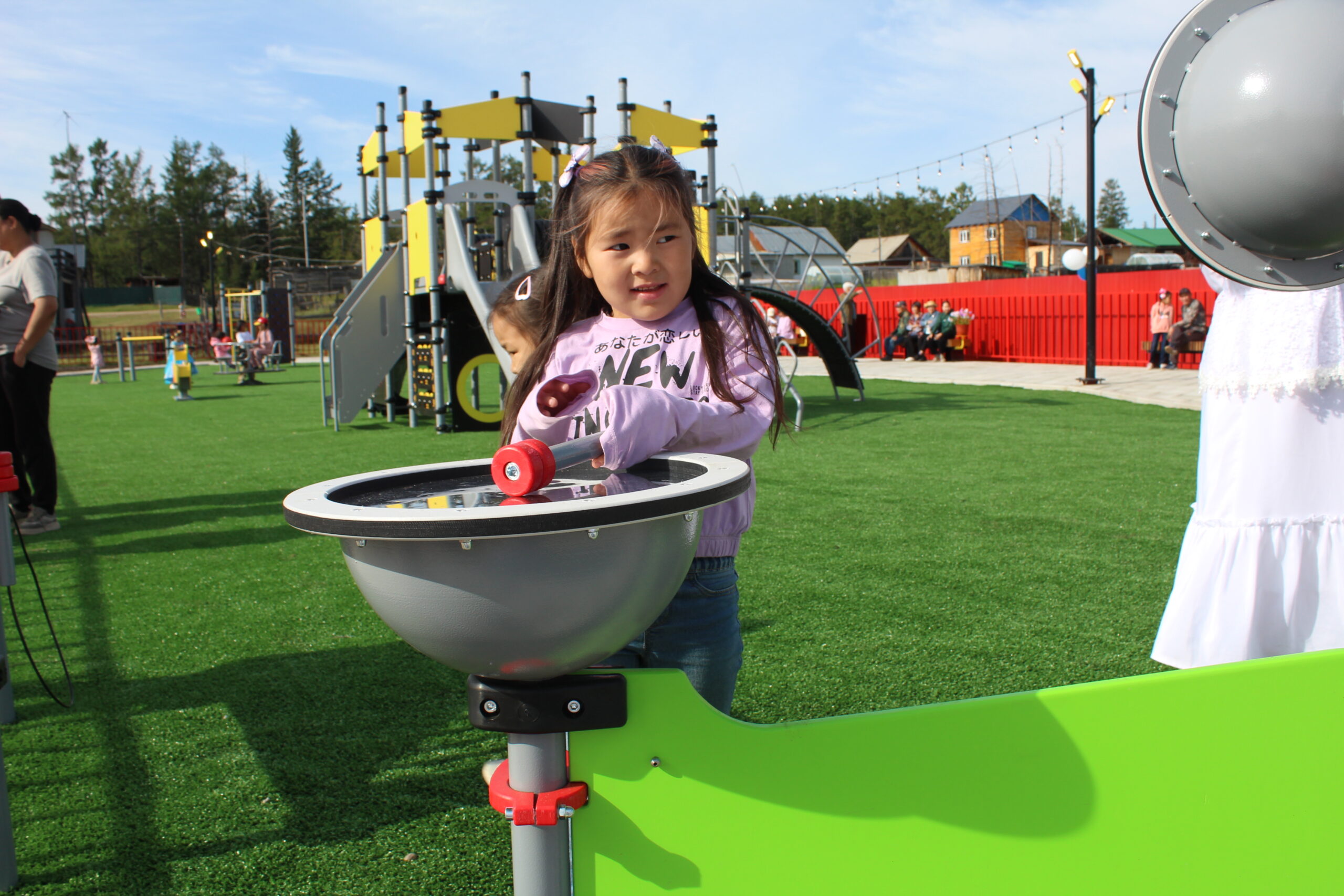 В сквере обустроили зоны отдыха, площадки для игр детей, спортивную зону и качели — чтобы каждый мог найти себе занятие по душе. Фонари в виде колосьев пшеницы, желтые элементы на фоне яркого красного цвета — дизайн малых архитектурных форм и уличной мебели сочетается с концепцией первого сквера в южной части села. В основе идеи — тема сельского хозяйства, которое является главной отраслью экономики и основным занятием жителей Намского наслега.