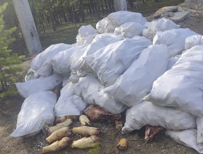 В Якутске на 22-м километре Вилюйского тракта неизвестные выгрузили мешки со свиными ногами, головами лошадей, конечностями крупного рогатого скота. Фотографии ЯСИА отправила жительница города, которая обнаружила несанкционированную биосвалку в понедельник, 19 мая. Сигнал наша редакция передала в Управление ветеринарии Якутска, после чего специалисты ведомства выехали на место.