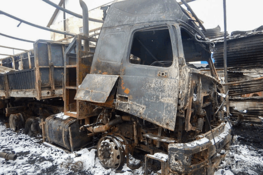 Вызов на возгорание в гараже поступил в 13:29. Через семь минут пожарные были на месте. Огонь частично повредил стены и кровлю строения на площади 30 кв. метров, а также четыре самосвала. Удалось спасти пять транспортных средств.