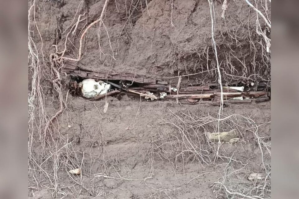 На кадрах, опубликованных в соцсетях, видно, как из берегового обрыва виднеется один скелет с черепом.