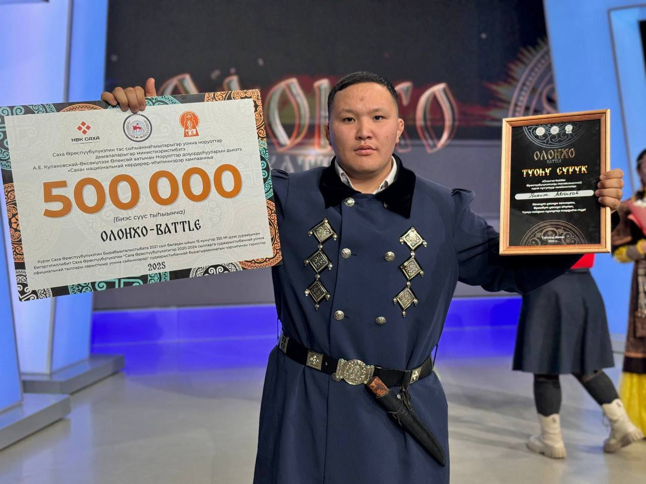 Также заслуженный артист республики Валентин Исаков пожелал участникам творческих успехов и вручил специальные призы: «Кэскиллээх олонхоһут» (Перспективный исполнитель) — Айталу Винокурову, и «Кэрэмэс олонхоһут» (Славный исполнитель) — Полине Гороховой.