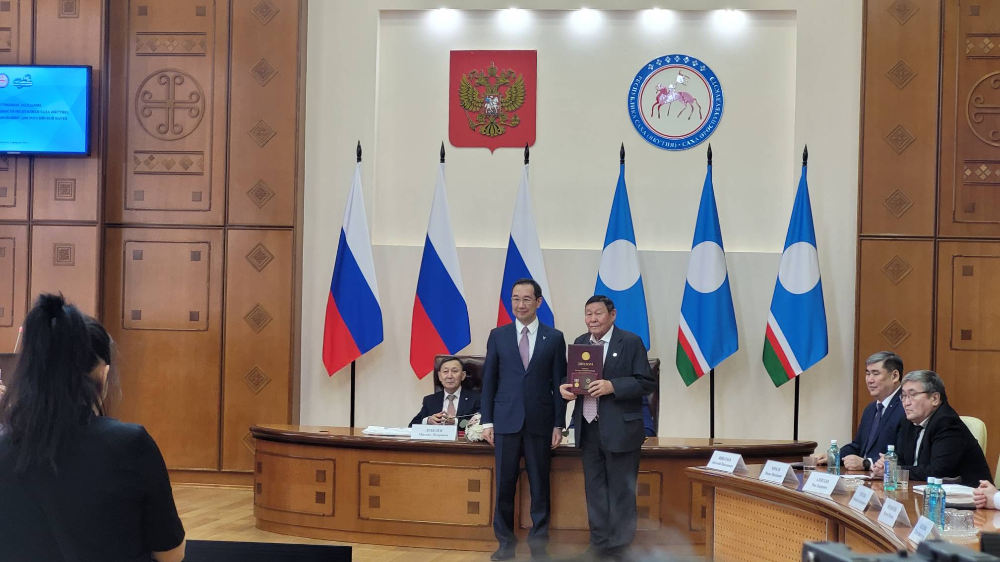 Вторая часть собрания традиционно посвящена награждению исследователей в области науки государственными наградами. Звание Заслуженного деятеля науки РС(Я) за многолетнюю, плодотворную работу получил представитель Академии наук Якутии, ее вице-президент Геннадий Толстых.