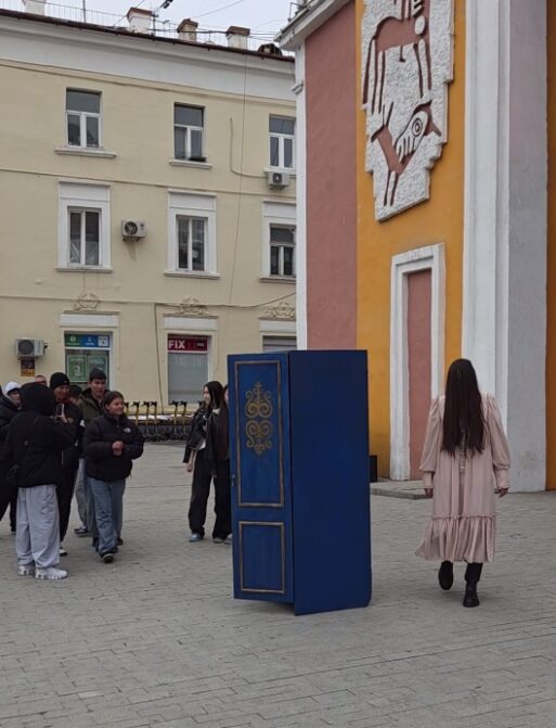 Старинный шкаф выступает как символ проекта – именно его зрители увидят на постерах, тизерах и в самом фильме. Этот синий шкаф не просто арт-объект, а настоящий реквизит с наших съёмок. Поэтому 21 сентября у прохожих была возможность в буквальном смысле прикоснуться к якутскому кинематографу.