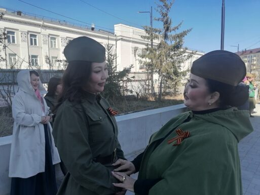 Зинаида Колодезникова в отличие от своих коллег, одетых в солдатское платье, вышла в развевающемся на ветру длинном черном, и проникновенно исполнила редкие песни на русском и якутском языках — одну за другой: «Молитва под снегопад» Алексея Калининского, «Сирота войны» Анастасии Варламовой и другие.