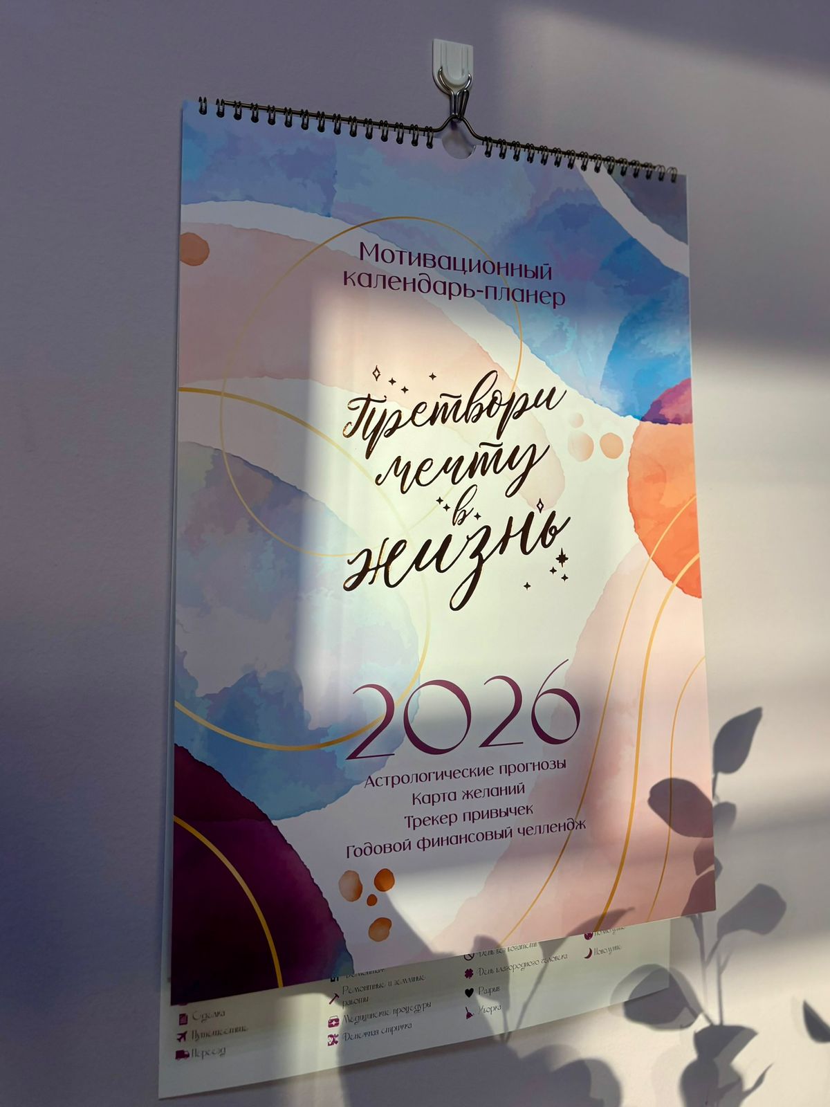 Новый год открывает двери к новым возможностям, а стильный перекидной календарь на 2026 год «Претвори мечту в жизнь» станет вашим источником вдохновения для достижения целей. Этот многофункциональный инструмент сочетает в себе пять полезных функций, превращая обычный календарь в мощный инструмент саморазвития: настенный планер с просторными ячейками. Астрологические прогнозы на каждый день: От Натальи Гуляевой, преподавателя БаЦзы школы Dr.Jin Peh. Трекер привычек: Формируйте новые полезные навыки. Карта желаний с сеткой Багуа и картинками: Заполните ее своими мечтами, и Карта будет подталкивать вас к их осуществлению на протяжении всего года. И годовой финансовый челлендж: Улучшите свою финансовую грамотность и достигайте материальных целей.