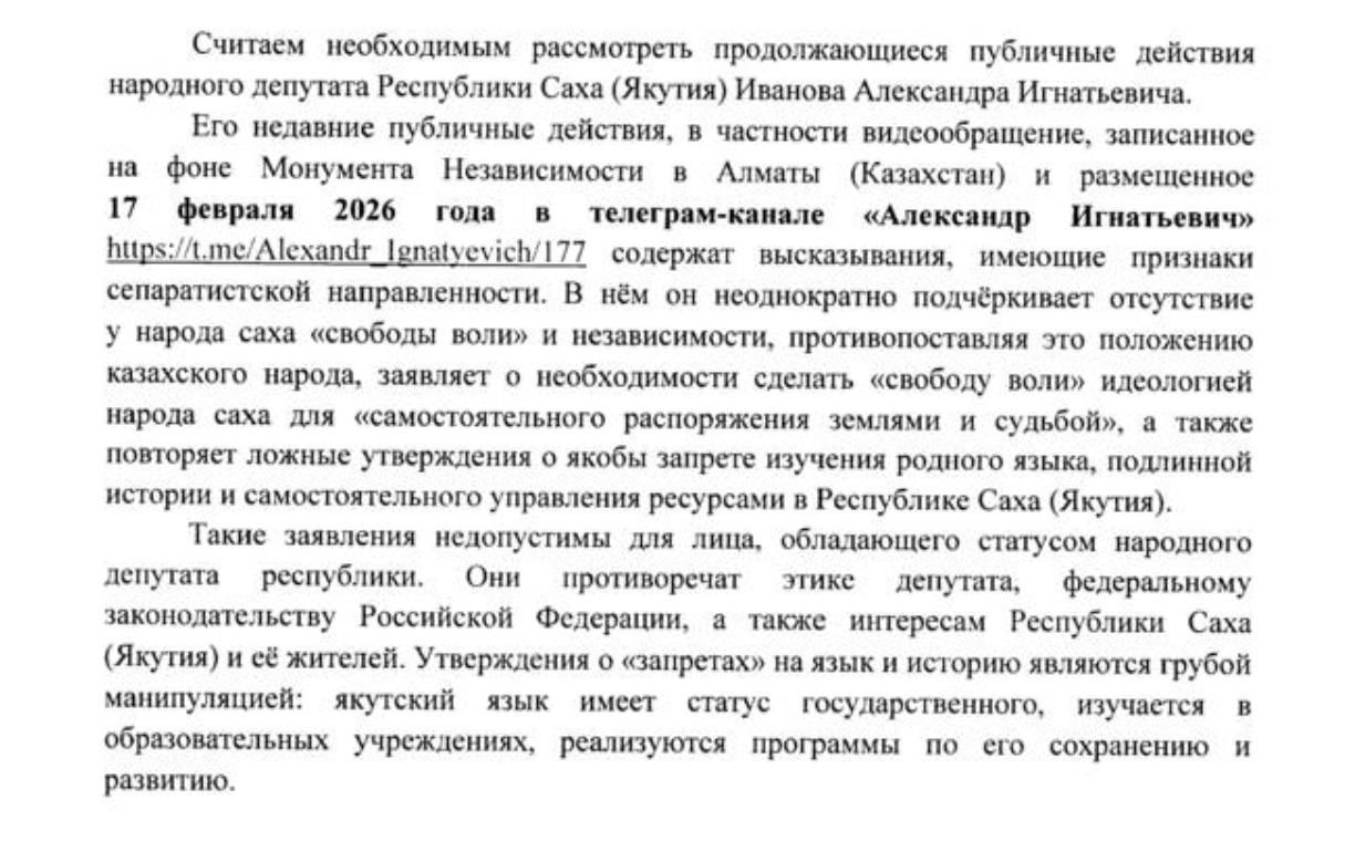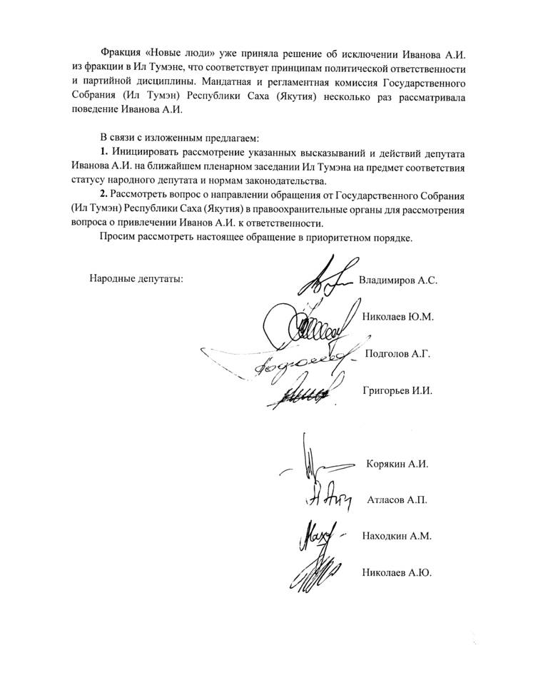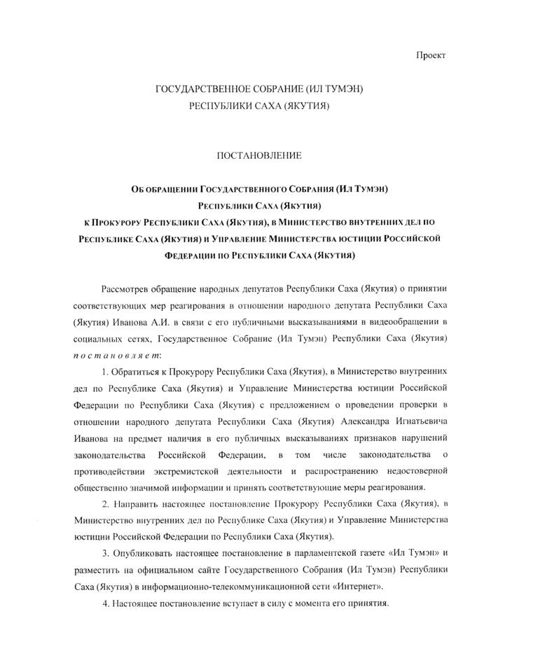 Обращение инициирует рассмотрение высказываний и действий депупата Ил Тумэна Александра Иванова на предмет соответствия статусу народного депутата и нормам законодательства, а также предлагается направить обращение Ил Тумэна в правоохранительные органы о привлечении А.Иванова к ответственности. Подписали восемь народных депутатов республики.