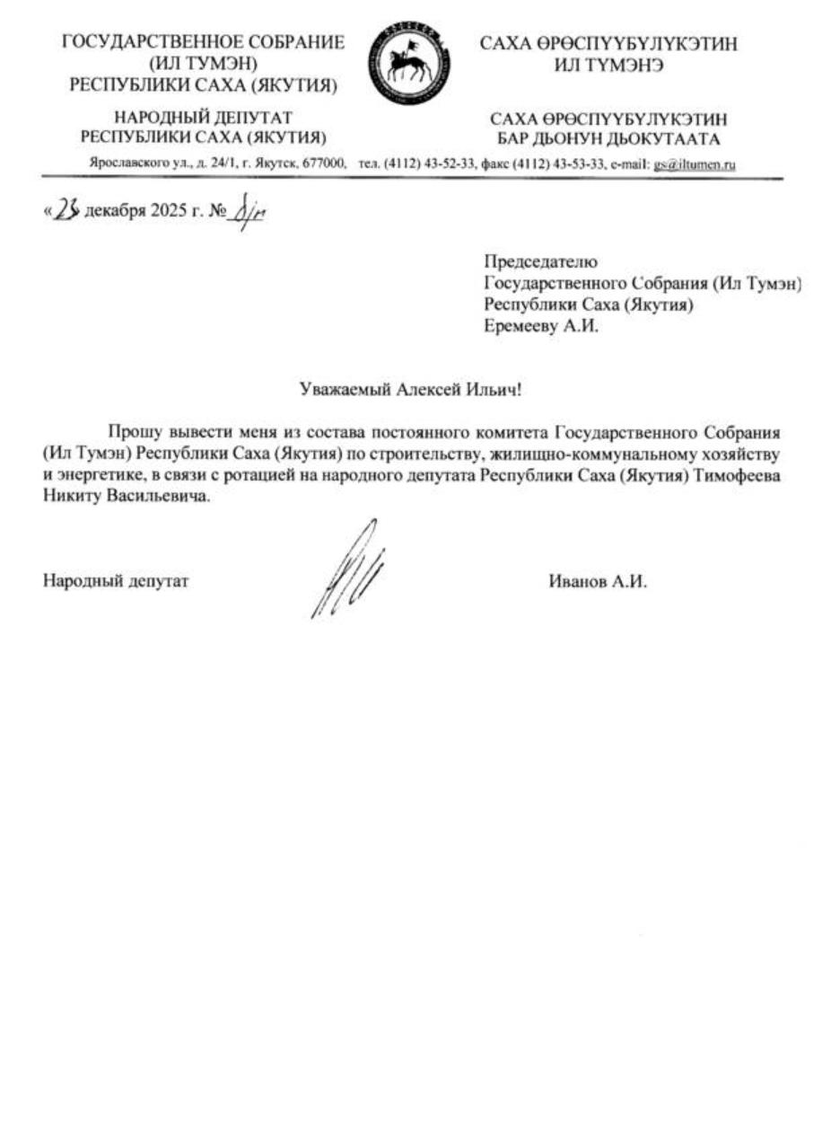 Депутат Иванов Александр попросил спикера Ил Тумэна Еремеева вывести его из состава Комитета по строительству, ЖКХ и энергетики, заменив его на депутата из фракции «Новые люди» Тимофеева Никиту, пишет Торбозное радио