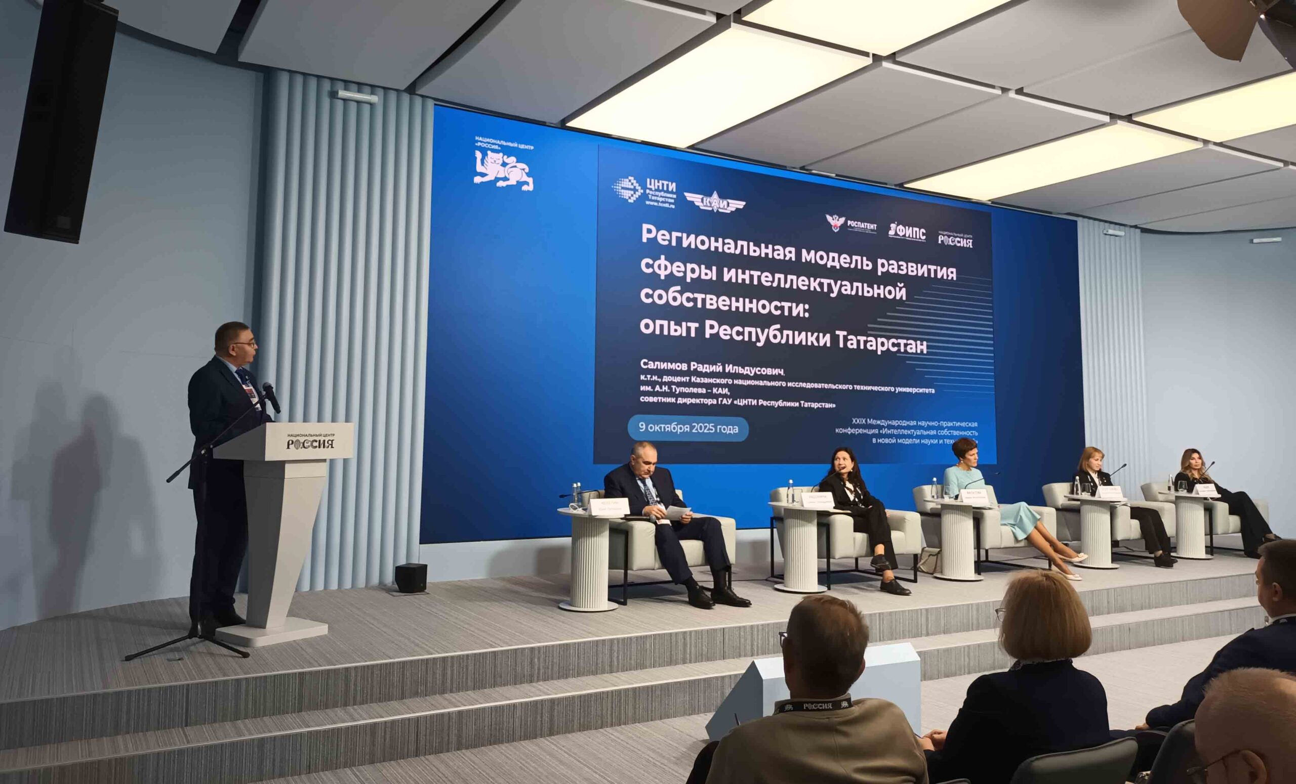Салимов Радий Ильдусович, советник ГАУ «ЦНТИ Республики Татарстан», представил к вниманию собравшихся доклад на тему «Региональная модель развития сферы интеллектуальной собственности: опыт Республики Татарстан», в котором изложил связь НТР РФ и государственной системой научно-технической информации, предложил модель планирования и управления НИОКР в субъектах РФ, указал инструменты поддержки инновационной и изобретательской активности организаций на примере Республики Татарстан. Особое внимание было уделено роли Академий наук субъектов Федерации, на которых, согласно предложенной модели, возлагается обязанность проведение анализа эффективности НИОКР в регионе, а также планирование НИОКР в будущем