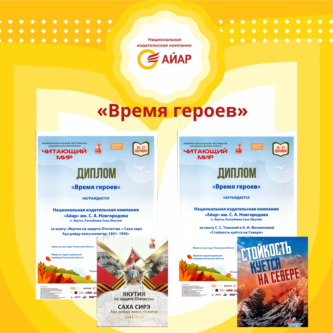 3.    «Дьоруойдар кэмнэрэ» номинацияҕа «Стойкость куется на севере» уонна «Якутия на защите Отечества  = Саха сирэ Аҕа дойду көмүскэлигэр: 1941-1945» диэн үйэлээх кинигэлэрбит анал дьупулуомнарынан бэлиэтэннилэр.