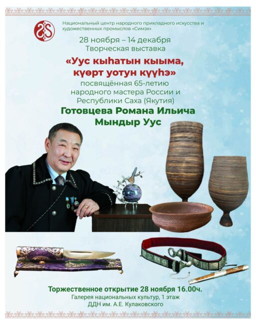 28 ноября состоится торжественное открытие юбилейной выставки «Уус кыһатын кыыма, күөрт уотун күүһэ», посвящённой 65-летию Романа Ильича Готовцева — выдающегося народного мастера России и Республики Саха (Якутия), хранителя и новатора якутских художественных традиций.