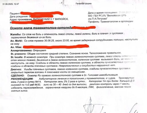 Что подтверждается справкой из Вилюйской ЦРБ от 31 августа 2025 года. Диагноз: ушибы плечевых суставов, левого коленного сустава, ссадины лучезапястных суставов, закрытый перелом головки 4 плюсневой кости со смещением.