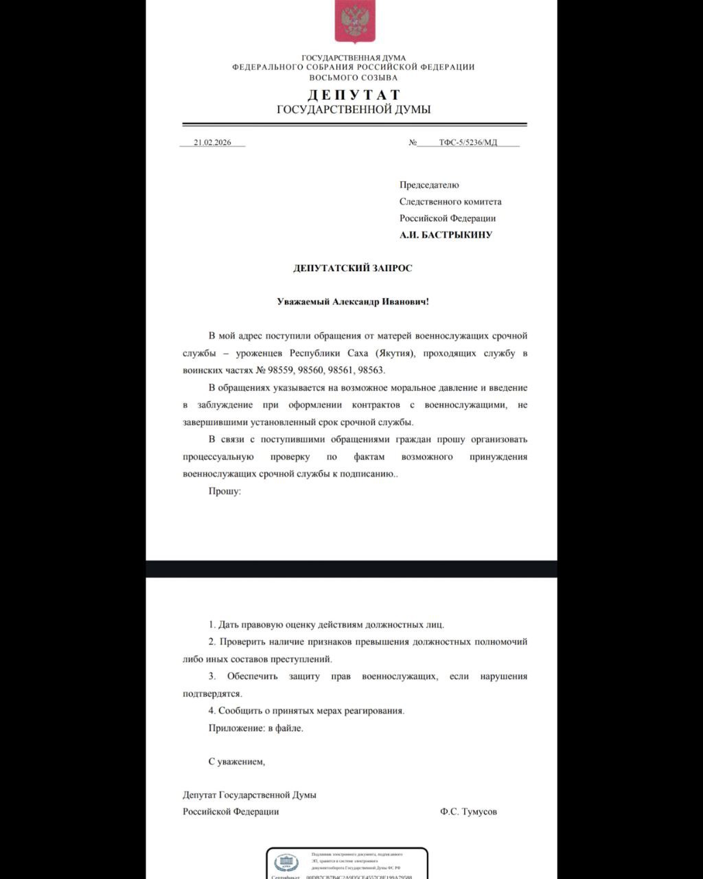 Депутат Госдумы РФ Федот Тумусов инициировал проверку по обращениям матерей солдат-срочников из Якутии. В своем тгк ТУМУСОВ.РФ он сообщает: