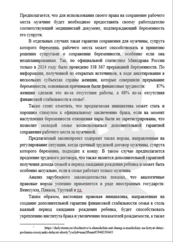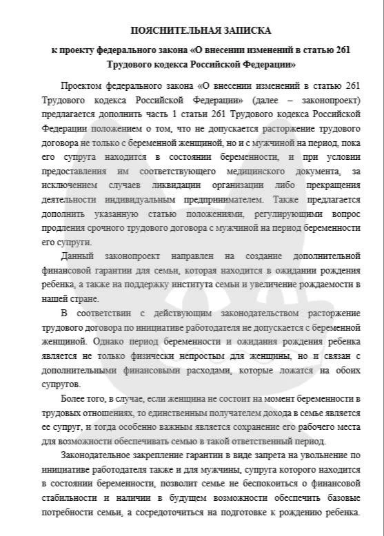 «Законодательное закрепление гарантии в виде запрета на увольнение по инициативе работодателя также и для мужчины, супруга которого находится в состоянии беременности, позволит семье не беспокоиться о финансовой стабильности и наличии в будущем возможности обеспечить базовые потребности семьи, а сосредоточиться на подготовке к рождению ребёнка».