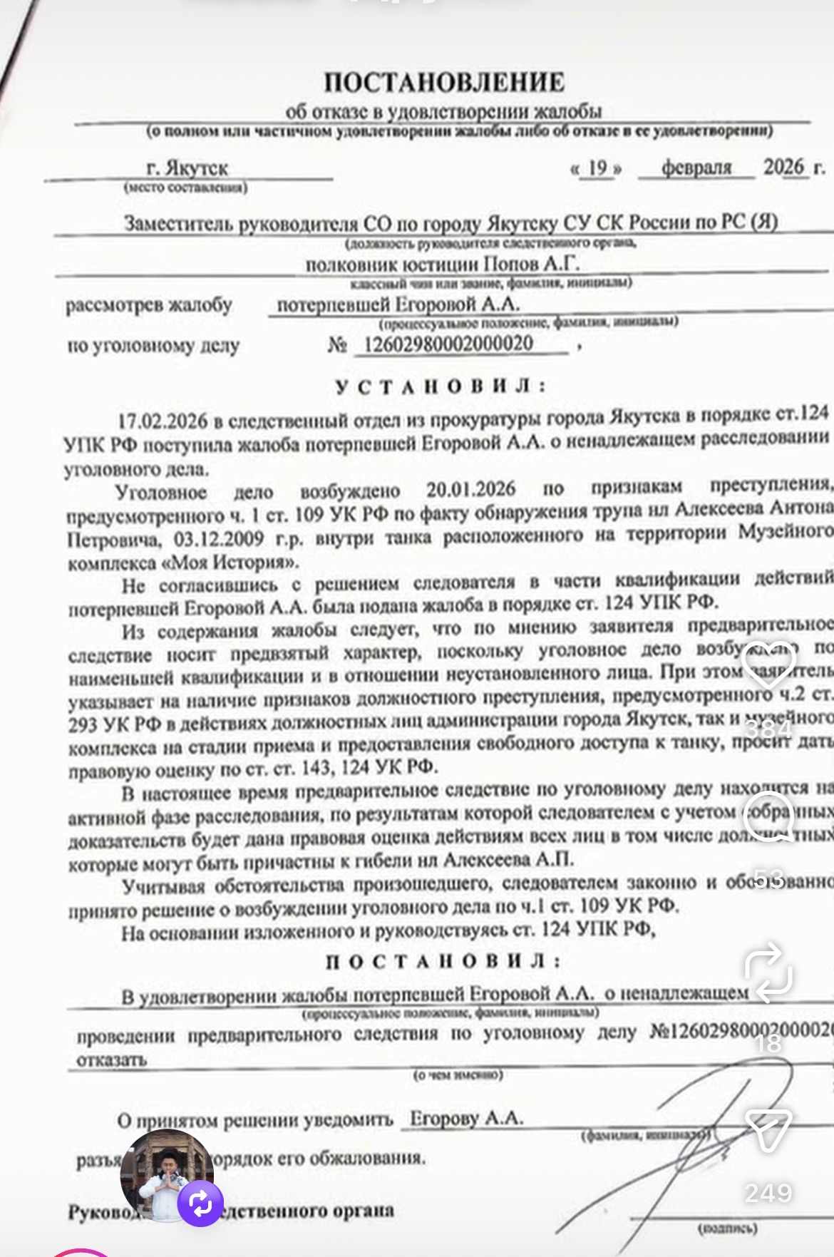 Айталина АЛЕКСЕЕВА, мама погибшего в музейном танке 16-летнего Антона Алексеева, разместила резонансное видео в своих соцсетях. 20 января трагическая смерть мальчика на территории Исторического парка «Россия – моя история» потрясла всю Якутию.