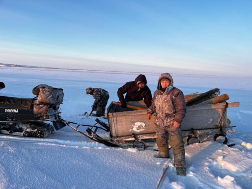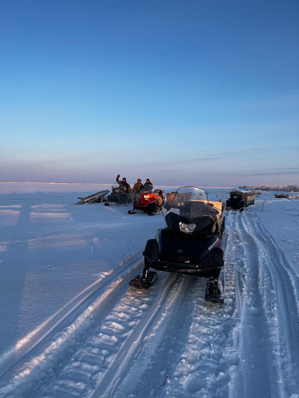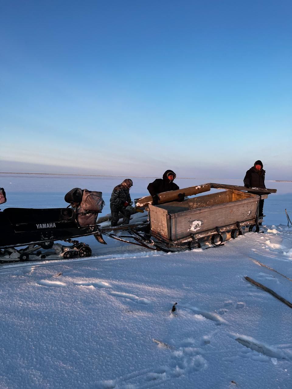 Недалеко от посёлка Чокурдах Якутии первая группа собирает дрова в кучи, а вторая группа доставляет их на буранах, разгружают возле офиса нацпарка, складирует.