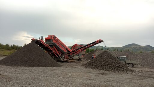 Возле грохота снует погрузчик, закидывающий в его нутро заготовку, камень проходит сквозь него, и из его длинных «рук» в разные стороны ссыпаются в две горы готовая ПГС – в одну сторону, в другую – крупные камни. Крупные используются для укрепления мягкого грунта, мелкая фракция – на «дорожку».