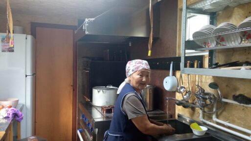 Люди за столом меняются, молодые ребята, быстро похватав, уходят, приходят другие. Люди постарше неторопливы. Например, Юрий Константинович Уваров, который работает здесь по хозяйству в поселке, и водитель КАМАЗа Айаас Ороев – он из Горного Алтая. Дружно говорят, что нравится работа, коллектив, организация.