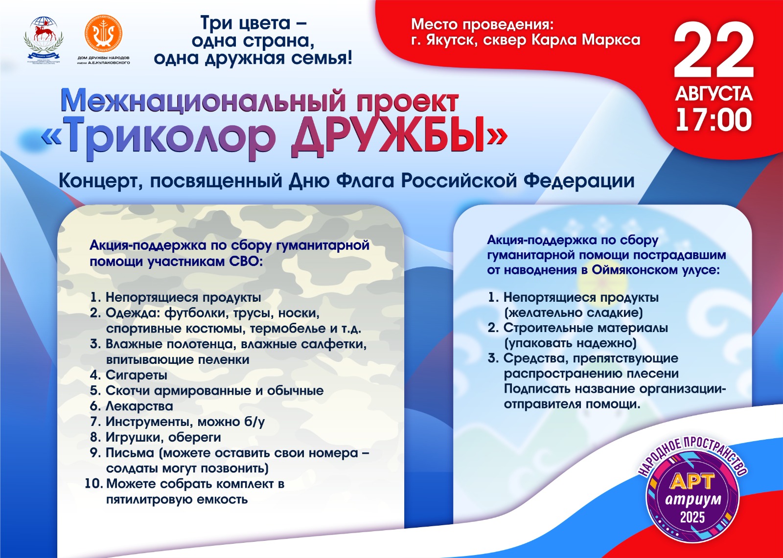 АУ РС(Я) «Дом дружбы народов имени А.Е. Кулаковского» в День Государственного флага Российской Федерации проводит межнациональный проект «Триколор ДРУЖБЫ». Событие объединит культуру, музыку, молодежные инициативы и благотворительность в одном большом пространстве.