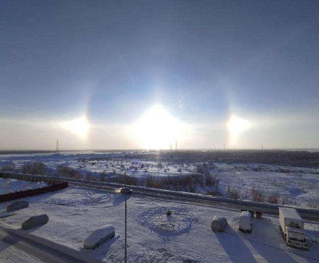 Явление «тройного солнца» – это редкий оптический феномен, называемый паргелий (или «ложное солнце»), часть более широкого явления гало, возникающая из-за преломления солнечного света в кристаллах льда в атмосфере. Это создает иллюзию двух ярких радужных пятен по бокам от настоящего солнца, которые выглядят как его «двойники». Для его возникновения нужны мороз, яркое солнце, определенная плотность облаков (перисто-слоистых) и шестигранные кристаллы льда, падающие определенным образом.