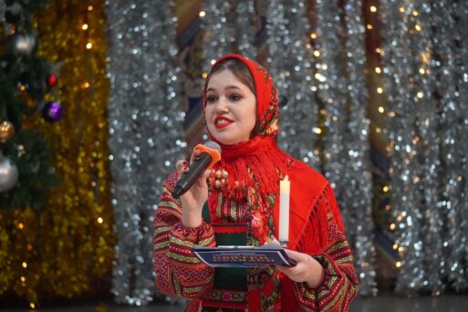 Первыми на сцену вышли самые юные участники — детский фольклорный ансамбль «Русь», детский коллектив «Раздолинки». Их звонкие голоса напомнили, что именно дети и молодёжь были первыми колядовщиками.