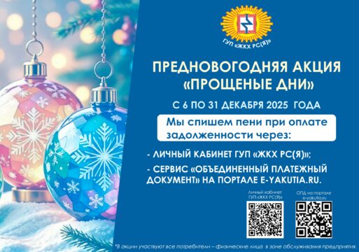 В преддверии Нового года ГУП «ЖКХ РС(Я)» запустило акцию «Прощеные дни». В рамках акции физические лица могут погасить имеющуюся задолженность без оплаты пеней по 31 декабря 2025 года.