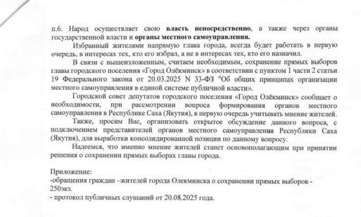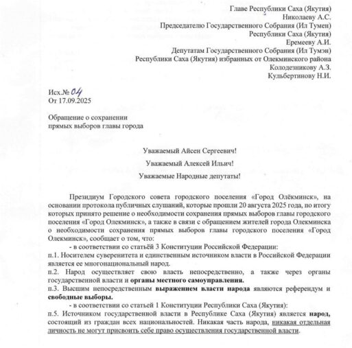 В подтверждение своего публичного заявления Щебляков опубликовал в своем телеграмм-канале письмо за подписью пяти депутатов — членов президиума городского Совета Олекминска. Депутаты обратились к главе Якутии, спикеру Ил Тумэна и депутатам от Олекминского района Алексею КОЛОДЕЗНИКОВУ и Николаю КУЛЬБЕРТИНОВУ с предложением сохранить прямые выборы мэра Олекминска. Имена подписантов он тоже назвал: ОРЛОВА, НЕПОМНЯЩАЯ, ЯКОВЛЕВА, САМАРИН и РОМАНЕНКО.