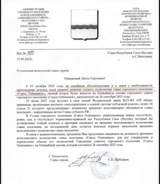 Содержание данного письма разительно отличается от публичной риторики Щеблякова. Мэр Олекминска сухо извещает, что им принято решение сложить полномочия главы городского поселения «Город Олёкминск» с 1 октября по семейным обстоятельствам и в связи с необходимостью прохождения лечения.