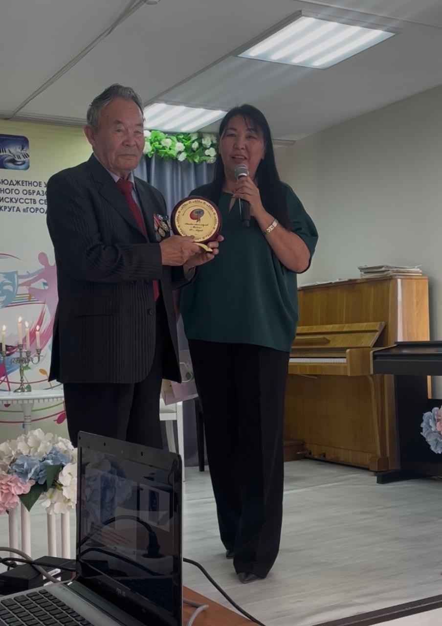 Запомнился волнительный момент, когда супруг Валентины Иннокентьевны — Георгий Степанович Яковлев — Почетный строитель, Почетный старейшина Якутии, выразил слова благодарности директору ДШИ Ларисе Николаевне Каратаевой и вручил подарок школе.