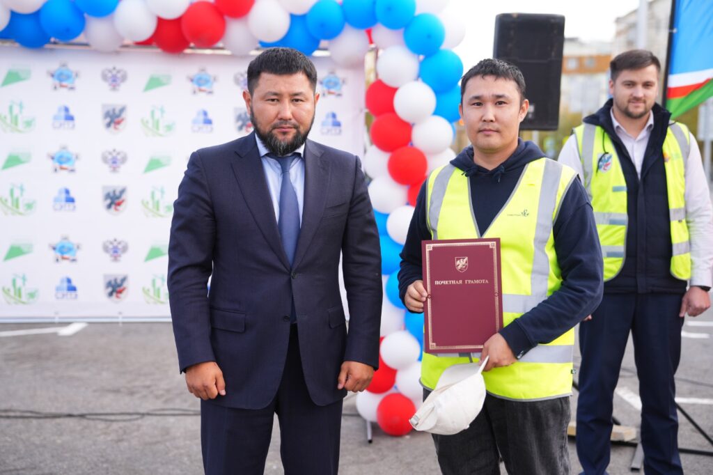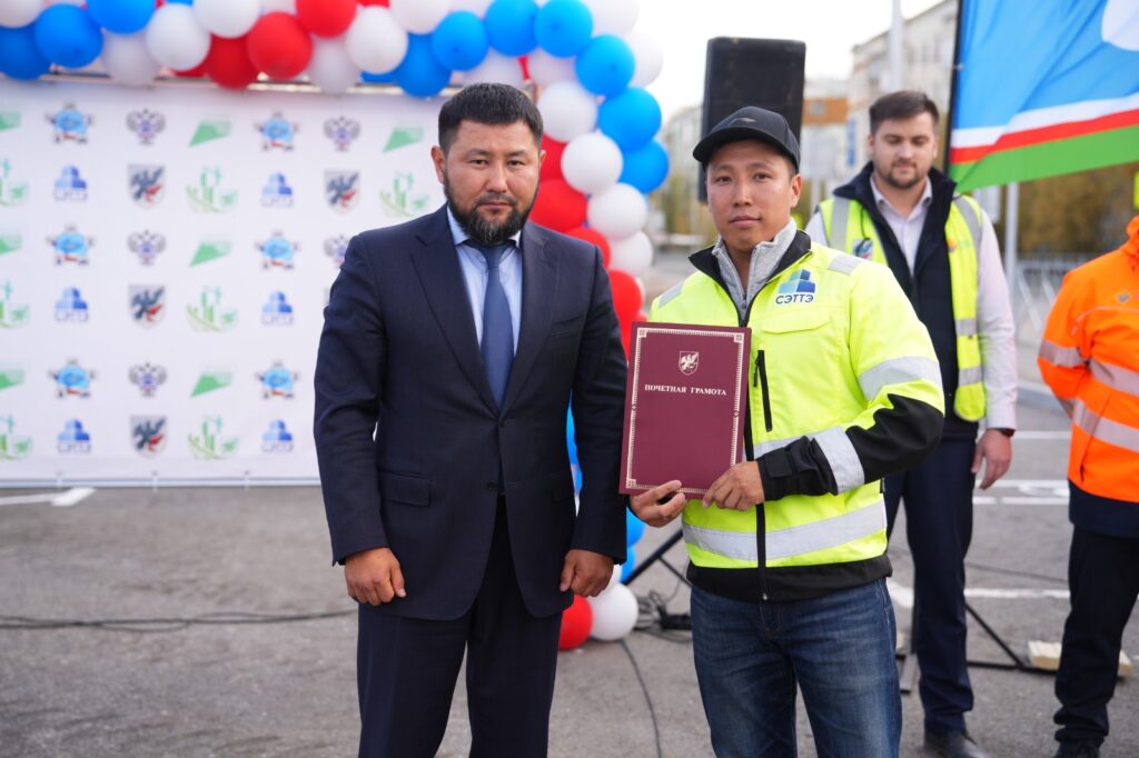 Почетные грамоты вручили производителю работ ООО ДРСУ «Сэттэ» Яну Николаеву, главному специалисту отдела дорожного строительства МКУ «Главстрой» Артему Кычкину. Благодарственное письмо вручили инженеру производственно-технического отдела ООО ДРСУ «Сэттэ» Александру Новгородову.