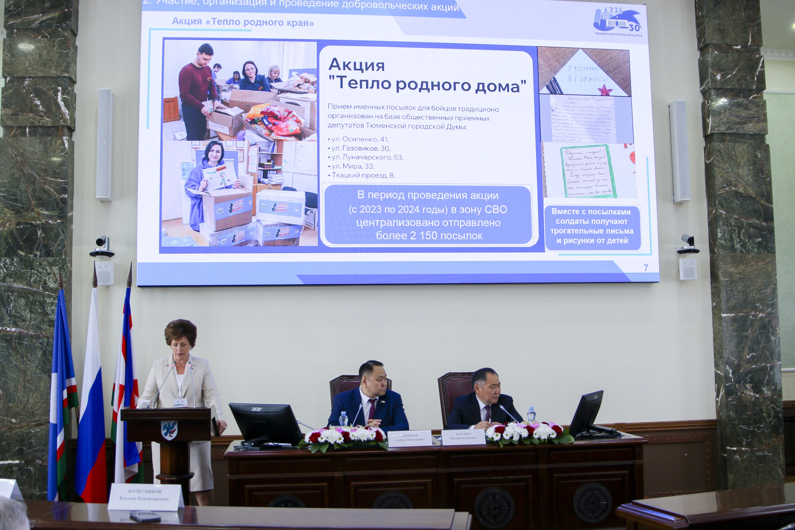 Среди наиболее значимых проектов в Тюменской городской Думе являются  сбор и направление в зону СВО гуманитарной помощи. Например, депутат Антипов Д.Н. каждый месяц по линии предприятия «ТДСК» каждый месяц в зону СВО отправляет 2 млн руб. Депутаты на базе общественных приемных собирают и отправляют именные посылки, принимают активное участие во всероссийских акциях партии «Единая Россия». Подписано соглашение о сотрудничестве с Краснодонским муниципальным округом ЛНР, кроме того, активно работает Молодежная палата, члены которой являются волонтерами многих мероприятий.