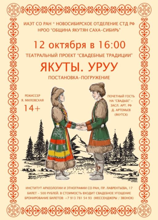 12 октября в Академгородке Новосибирска начал свой путь совместный проект Института археологии и этнографии СО РАН и Новосибирского отделения Союза театральных деятелей России «Свадебные традиции». Честь открывать свадебный цикл выпала якутской свадьбе «Уруу́». В октябре — ноябре свои свадебные обряды покажут буряты, татары и узбеки.