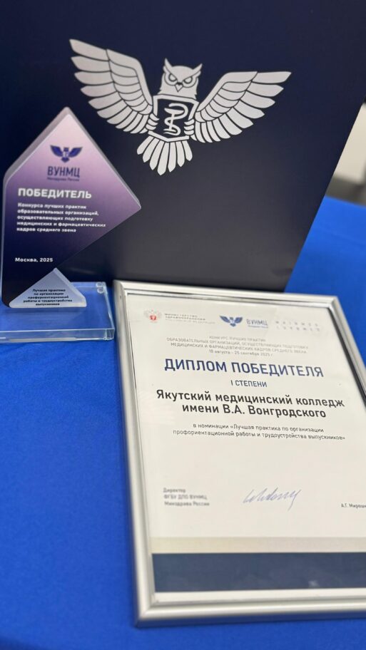 Якутский медицинский колледж имени В. А. Вонгродского занял первое место в номинации «Лучшая практика по организации профориентационной работы и трудоустройства выпускников» в конкурсе лучших практик образовательных организаций, осуществляющих подготовку медицинских и фармацевтических кадров среднего звена на II Всероссийской научно-практической конференции «Специалисты среднего звена в медицине и фармации». Конференция прошла в Москве с 22 по 25 сентября 2025 года.