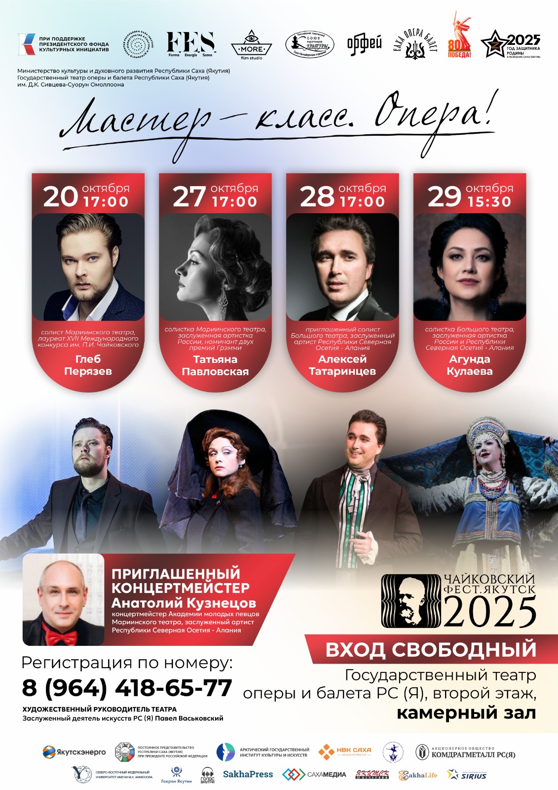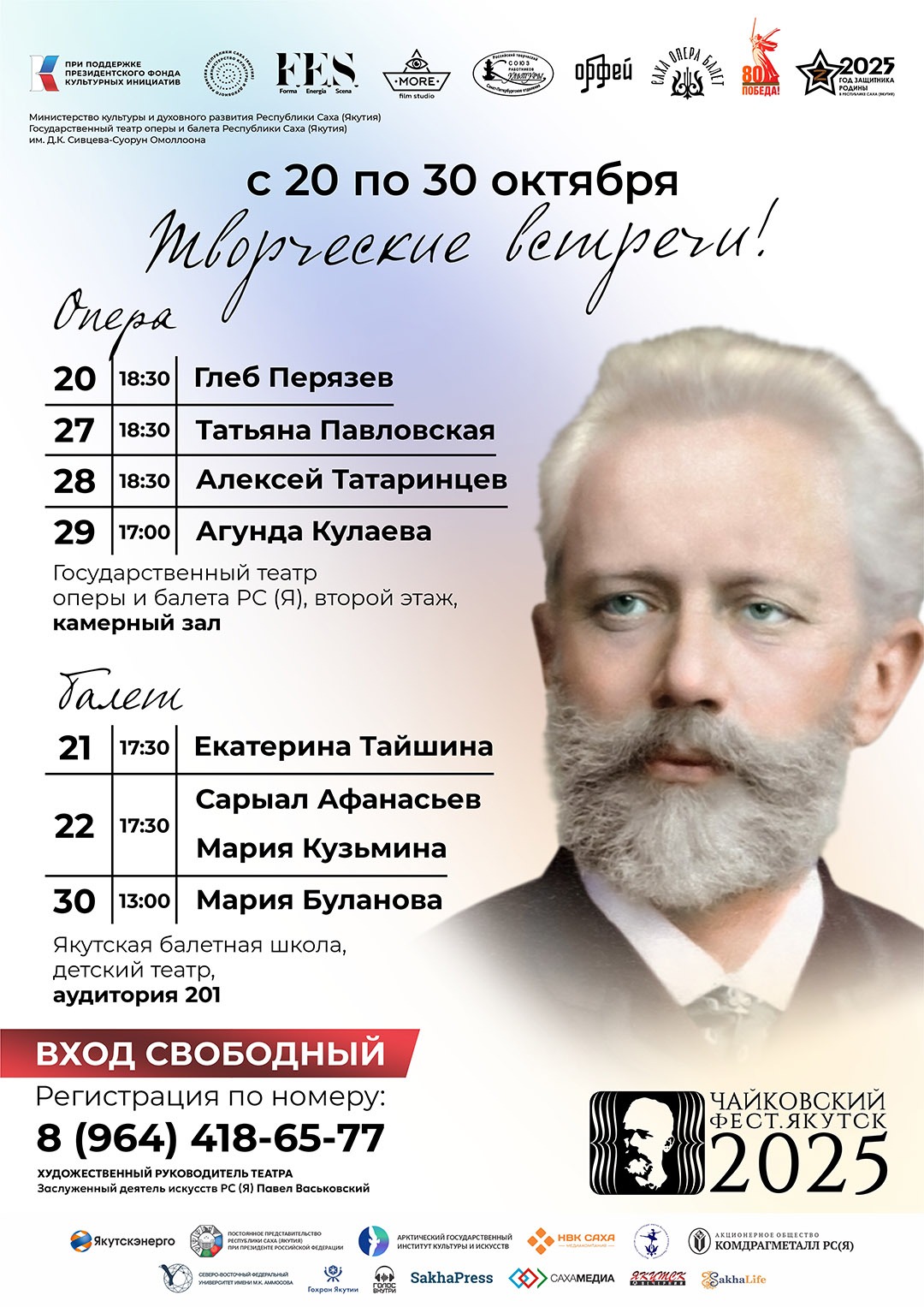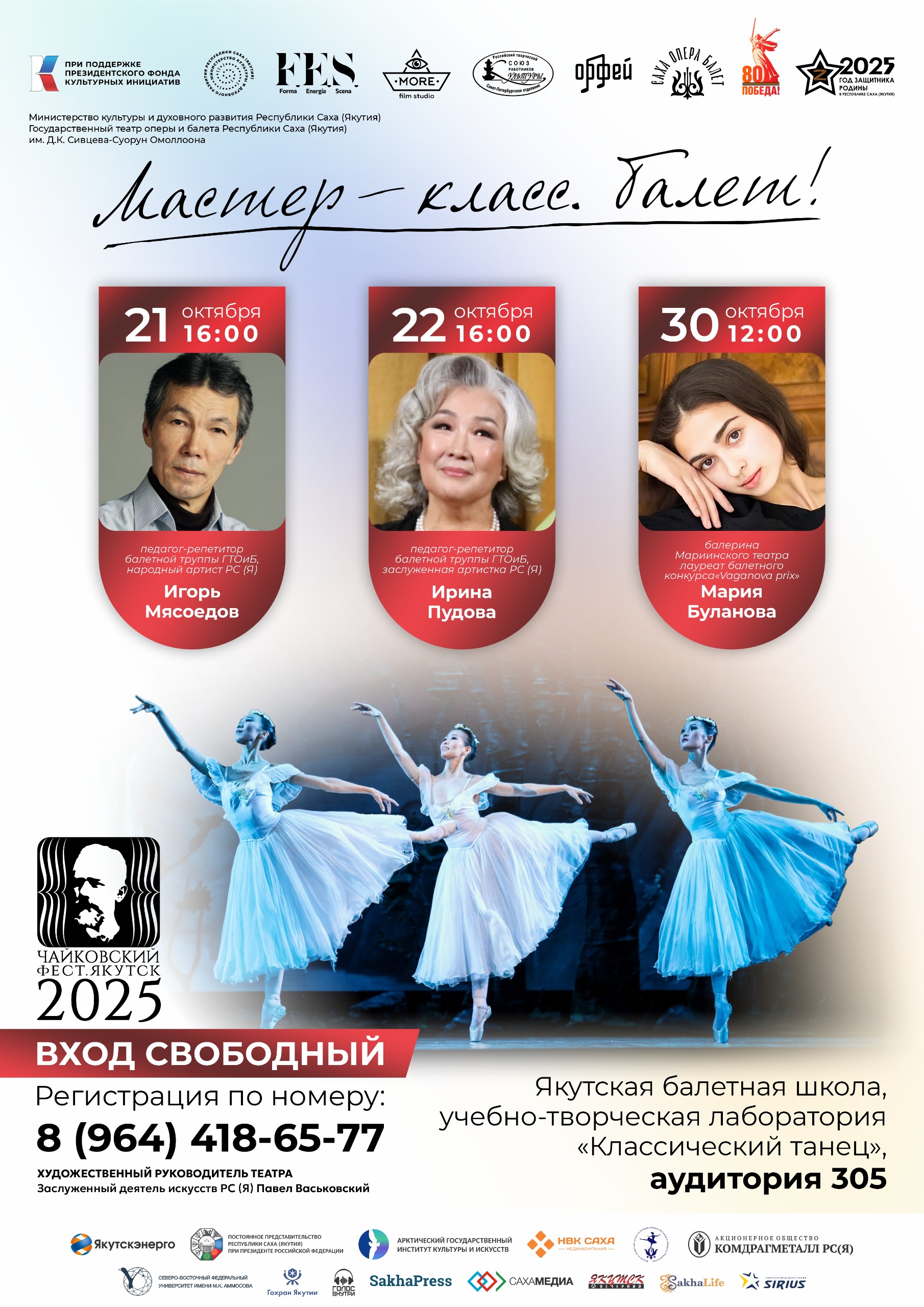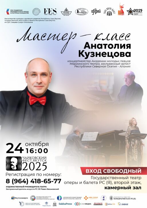 Звезды Большого и Мариинского театров, а также опытные репетиторы Театра оперы и балета им. Д.К. Сивцева – Суоруна Омоллоона проведут обширную программу мастер-классов. Попасть на такое занятие сможет каждый желающий, но в качестве активных участников приглашаются студенты и преподаватели профильных вузов и ссузов, молодые артисты. Эта образовательная составляющая предусмотрена в рамках оперно-балетного фестиваля «Чайковский-фест. Якутск», который состоится в столице республики с 17 по 31 октября. Проект реализуется благодаря поддержке Президентского фонда культурных инициатив.