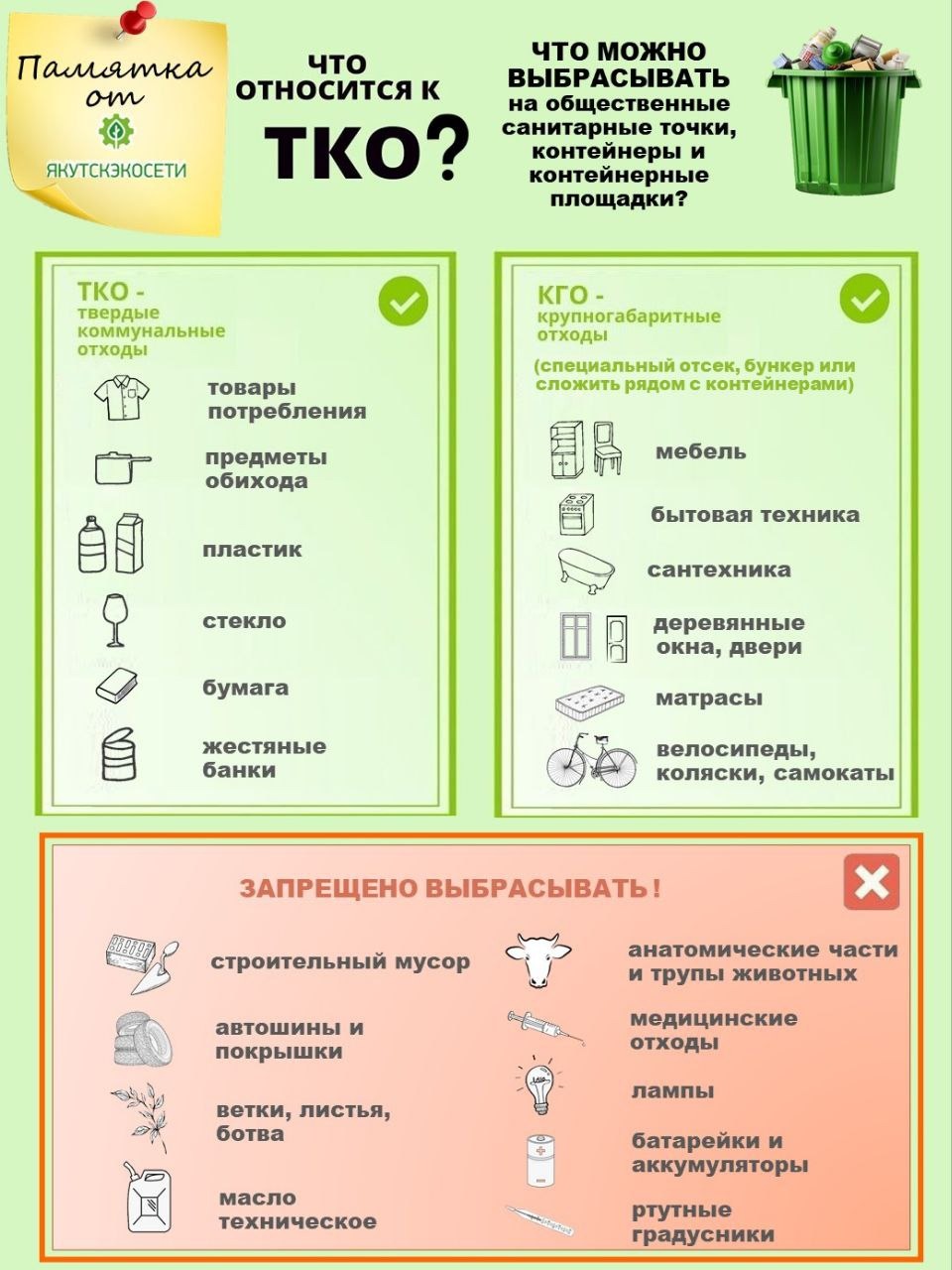 Также, следует отметить, что жители частного сектора должны вывозить крупногабаритные отходы до ближайшей общественной санитарной точки своими силами. Запрещено выбрасывать в контейнеры: строительный мусор, автопокрышки, спил деревьев, листву, ботву, масло техническое, анатомические части животных, медицинские отходы, лампы, батарейки, аккумуляторы, ртутные градусники и пр.