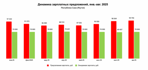 Актуальная медиана предлагаемой заработной платы составляет в Якутии 99 794 рубля, тогда как уровень ожидаемой зарплаты — 70 000 рублей.