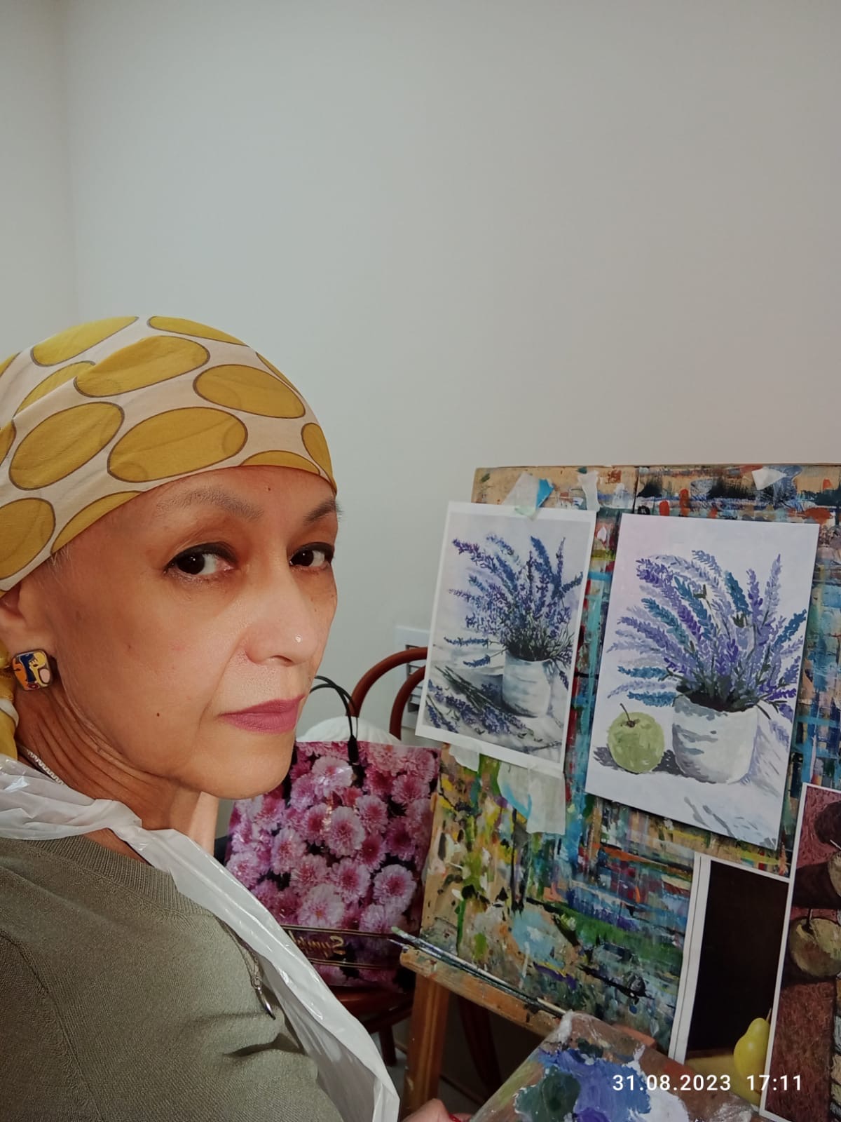 Первое моё мероприятие в группе было открытие выставки картин онкопациентов в НХМ, приуроченное ко Дню борьбы с раком, 4 февраля 2023 года. Я пришла из любопытства и с желанием выйти из своего кокона. В то время уже без волос, лысая, в какой-то шапке, в маске, мне таким образом хотелось прятаться от знакомых.