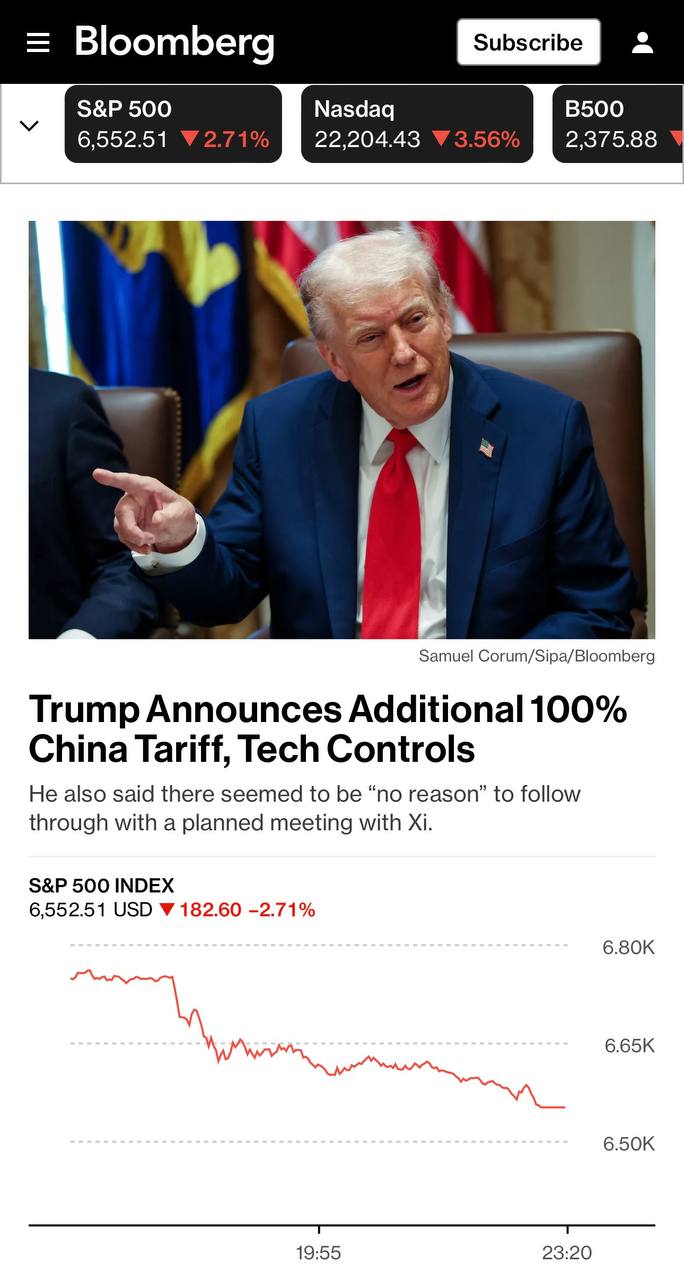 Основываясь на том факте, что Китай занял эту беспрецедентную позицию, начиная с 1 ноября 2025 года (или раньше, в зависимости от любых дальнейших действий или изменений, предпринятых Китаем), США введут таможенный тариф. 100% для Китая, сверх любого тарифа, который они платят в настоящее время. Также с 1 ноября мы введем экспортный контроль на все критически важное программное обеспечение. Невозможно поверить, что Китай пошел бы на такие действия, но они пошли, а остальное уже история», сообщает тгк Пул№3