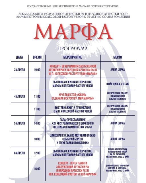 4 апреля в 11:00 ч в историческом зале Национальной библиотеки РС(Я) состоится круглый стол «ЖИЗНЬ, ОТДАННАЯ ИСКУССТВУ: МИР МАРФЫ» к 75-летию заслуженной артистки Российской Федерации и народной артистки РС(Я) Марфы Колесовой-Расторгуевой. Мероприятие пройдет в сотрудничестве с Государственным цирком РС(Я) и Национальной библиотекой РС(Я).