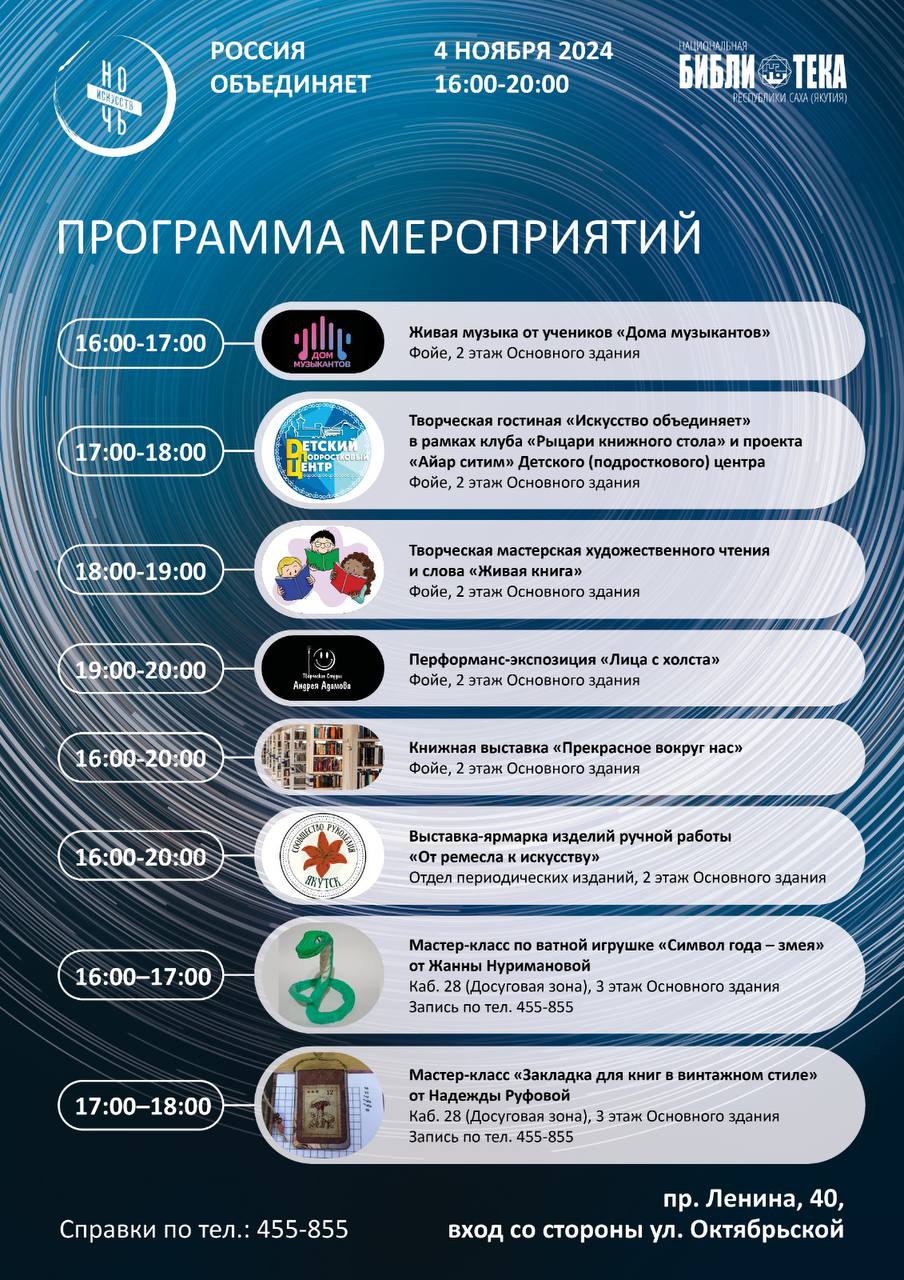 Национальная библиотека Республики Саха (Якутия) традиционно присоединяется к масштабной акции. 4 ноября с 16.00 на площадках библиотеки начнутся мастер-классы, концерты, игры и встречи. Ждем всех!