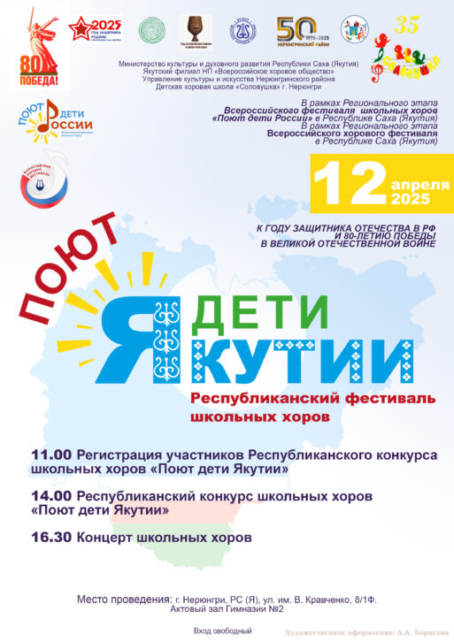 12-13 апреля 2025 года в г. Нерюнгри в очно-заочной форме пройдет Республиканский фестиваль школьных хоров «Поют дети Якутии» в рамках Региональных этапов Всероссийского Фестиваля школьных хоров «Поют дети России» и Всероссийского хорового Фестиваля в Республике Саха (Якутия), посвященных Году защитника Отечества в РФ и 80-летию Победы в Великой Отечественной войне в 2025 году.