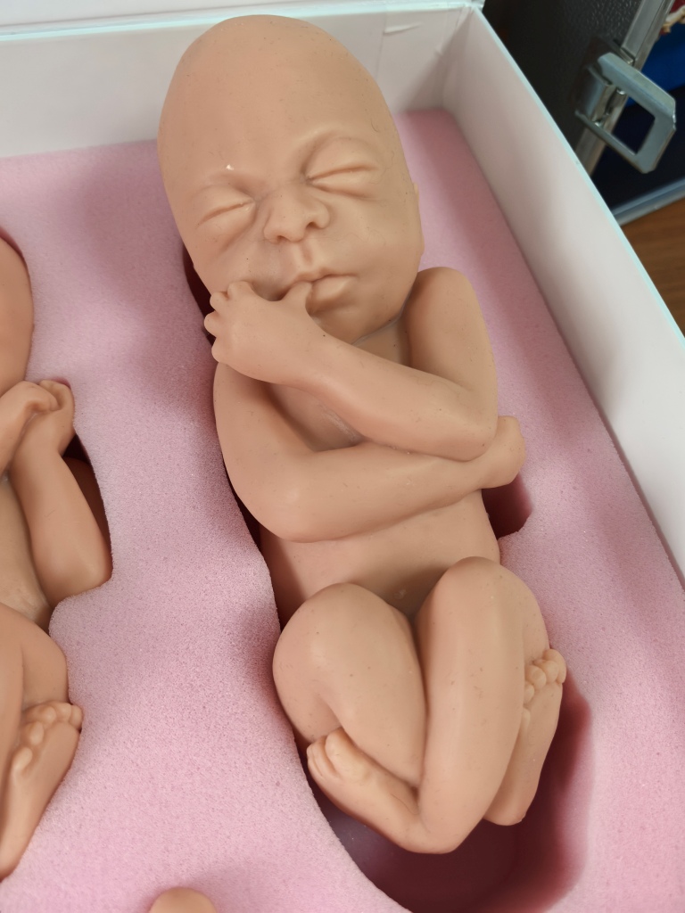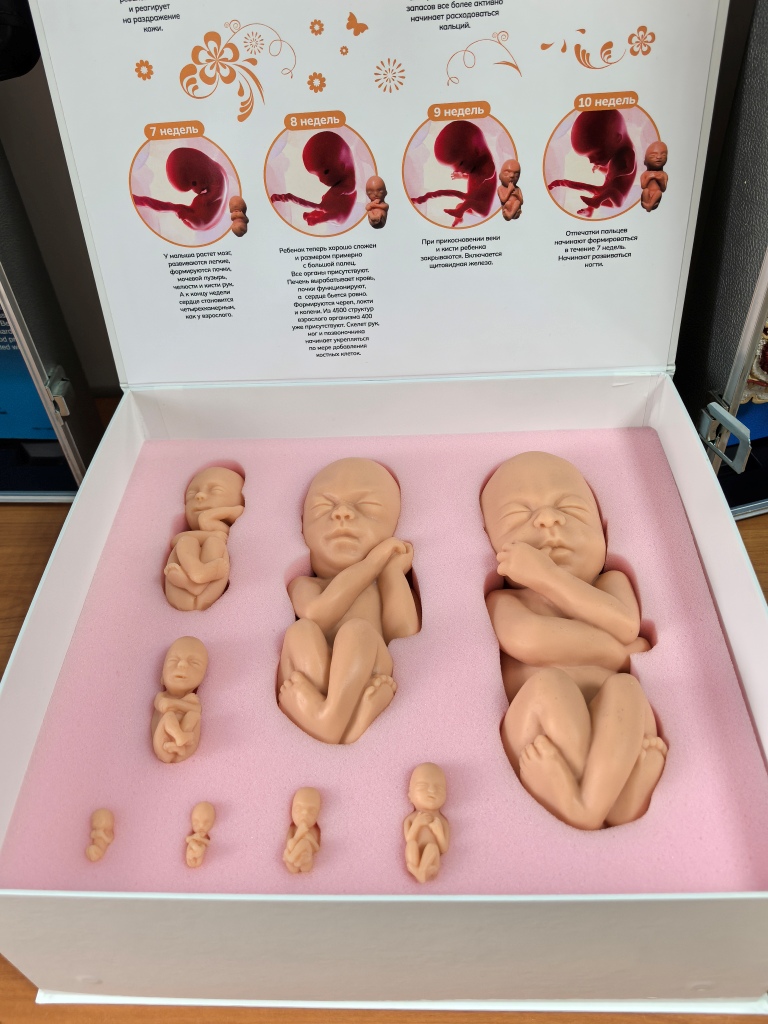 Мы идем в музей поликлиники, чтобы взглянуть на подарок. Анна Константиновна открывает красивую коробку с надписью «Жизнь ребенка до рождения», достает силиконовые фигурки (рост самой маленькой меньше сантиметра, этому малютке всего 7 недель, а вес самого большого муляжа в наборе, ему 26 недель развития, уже ощущаешь, взяв в руки, он весит около килограмма).