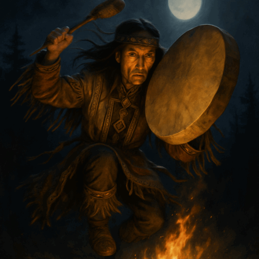 Перед камланием он сидит в тишине, ждёт знак от духов-помощников и Предков.